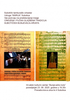Predstavljanje knjige Crkvena i pučka glazbena tradicija subotičkih Bunjevaca Hrvataige Crkvena i pučka glazbena tradicija subotičkih Bunjevaca Hrvata autora Stipana Jaramazovića bit će u ponedjeljak 23. lipnja 2025. s početkom u 19 i 30 sati u Hrvatskom kulturnom centru Bunjevačko kolo.